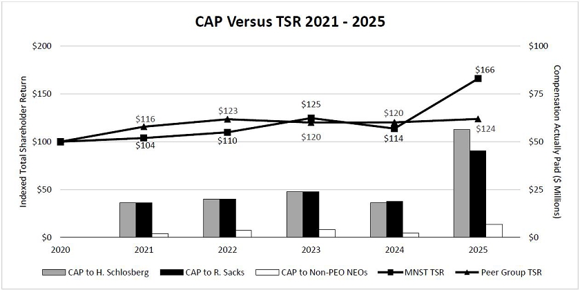 For the fiscal year ended December 31, 2025, the Company’s Compensation Committee was comprised of Ms. Demel (from June 2025), Mr. Fayard (through June 2025), Ms. Jackson and Mr. Vidergauz. Mr. Vidergauz served as Chairman. The Compensation Committee is responsible for reviewing, developing and recommending to the Board the appropriate management compensation policies, programs and levels, and reviewing the performances of the Chief Executive Officer, President and other senior executive officers periodically in relation to certain objectives. The Compensation Committee is ultimately responsible for determining, affirming or amending the level and nature of executive compensation of the Company. The Compensation Committee has access, at the Company’s expense, to independent, outside compensation consultants for both advice and competitive data for the purpose of making such determinations. For more information on the Compensation Committee’s processes and procedures for the consideration and determination of executive and director compensation, see “Compensation Discussion and Analysis – Setting Executive Compensation for 2025” and “Director Compensation.” The Board of Directors has adopted a written charter as amended and restated from time to time, for the Compensation Committee, a copy of which is available on our website at http://investors.monsterbevcorp.com/governance.cfm.